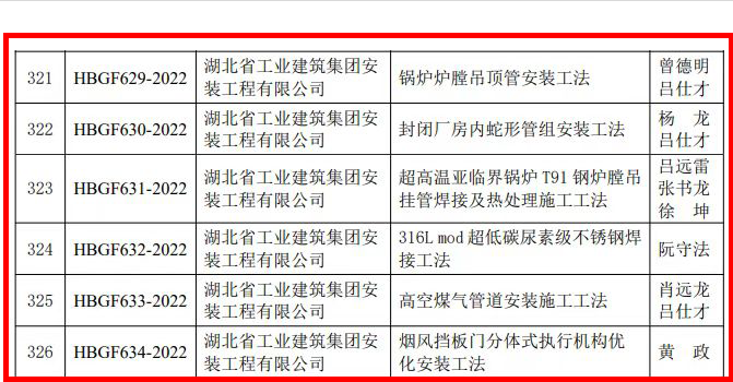 近日,湖北省住房和城鄉(xiāng)建設(shè)廳發(fā)布了《關(guān)于2022年度湖北省工程建設(shè)工法(土木工程類、工業(yè)安裝工程類)評(píng)審結(jié)果的公告》,安裝公司申報(bào)的《鍋爐爐膛吊頂管安裝工法》、《封閉廠房內(nèi)蛇形管組安裝工法》等6項(xiàng)工法被評(píng)為2022年度省級(jí)工法。