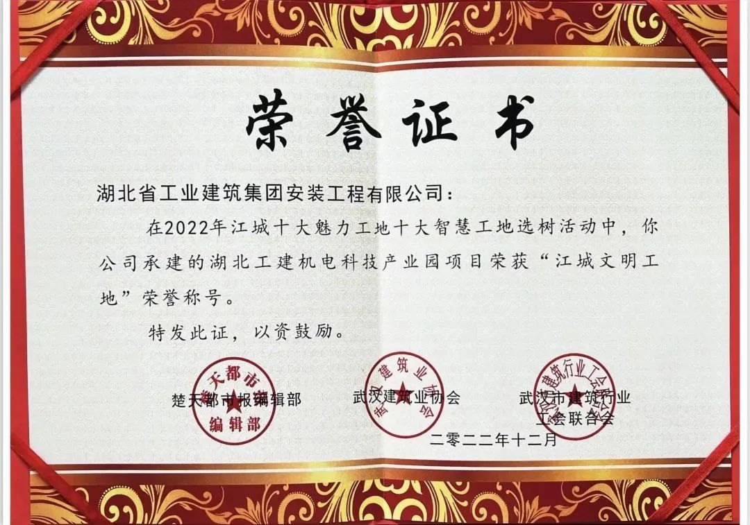 湖北工建機電科技產業園項目榮獲武漢市安全文明示范項目和湖北省安全文明示范項目