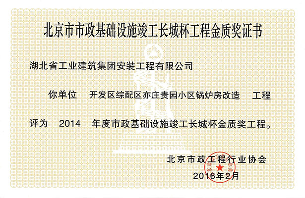 公司2014年度在北京市開發區綜配區亦莊貴園小區的鍋爐房改造工程,于2016年2月被北京市政工程行業協會授予北京市市政基礎設施竣工長城杯工程金質獎。該獎的獲得代表了我公司在市政工程的施工中質量有了質的提高,并且得到了北京市政工程行業協會的認可。